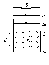 (16分)如圖所示,電阻忽略不計(jì)的、兩根平行的光滑金屬導(dǎo)軌豎直放置,其上端接一阻值R=3Ω的定值電阻.在水平虛線L1、L2間有一與導(dǎo)軌所在平面垂直的勻強(qiáng)磁場(chǎng)B,磁場(chǎng)區(qū)域的高度為d=0.5m.導(dǎo)體桿a的質(zhì)量ma=0.2kg、電阻Ra=6Ω;導(dǎo)體桿b的質(zhì)量mb=0.6kg、電阻Rb=3Ω,它們分別從圖中M、N處同時(shí)由靜止開(kāi)始在導(dǎo)軌上無(wú)摩擦向下滑動(dòng),且都能勻速穿過(guò)磁場(chǎng)區(qū)域,當(dāng)a桿剛穿出磁場(chǎng)時(shí)b桿正好進(jìn)入磁場(chǎng).重力加速度為g=10m/s2.(不計(jì)a、b之間的作用)求: