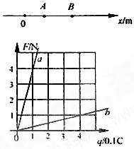 在一個(gè)點(diǎn)電荷Q的電場中,Ox坐標(biāo)軸與它的一條電場線重合,坐標(biāo)軸上A、B兩點(diǎn)的坐標(biāo)分別為2.0m和5.0m。放在A、B兩點(diǎn)的試探電荷受到的電場力方向都跟x軸的正方向相同,電場力的大小跟試探電荷所帶電量的關(guān)系圖象如圖中直線a,b所示,放在A點(diǎn)的試探電荷帶正電,放在B點(diǎn)的試探電荷帶負(fù)電。求: