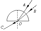 如圖所示,一條紅色光線和另一條紫色光線,以不同的角度同時(shí)沿不同的半徑方向射入同一塊半圓形玻璃磚,其透射光線都是由圓心O點(diǎn)沿OC方向射出.則可知( )