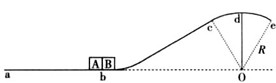 (10分)如圖所示,一條軌道固定在豎直平面內(nèi),粗糙的ab段水平,bcde段光滑,cde段是以O(shè)為圓心、R為半徑的一小段圓弧?梢暈橘|(zhì)點的物塊A和B緊靠在一起,靜止于b處,A的質(zhì)量是B的3倍。兩物塊在足夠大的內(nèi)力作用下突然分離,分別向左、右始終沿軌道運動。分離時B的速度是A的速度的3倍,B到d點時速度沿水平方向,此時軌道對B的支持力大小等于B所受重力的3/4,A與ab段的動摩擦因數(shù)為μ,重力加速度g,求: