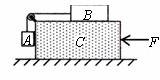 如圖所示,長方體物塊C置于水平地面上,物塊A、B用不可伸長的輕質(zhì)細繩通過滑輪連接(不計滑輪與繩之間的摩擦),A物塊與C物塊光滑接觸,整個系統(tǒng)中的A、B、C三物塊在水平恒定推力F作用下從靜止開始以相同的加速度一起向左運動.下列說法正確的是 ( )