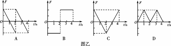 矩形線框abcd放在勻強磁場中靜止不動,磁場方向與線圈平面垂直,磁感應強度B隨時間t變化的圖象如圖甲所示。設t=0時刻,磁感應強度的方向垂直紙面向里,則在0~4s時間內(nèi),圖乙中能正確表示線框ab邊所受的安培力F隨時間t變化的圖象是 ( )