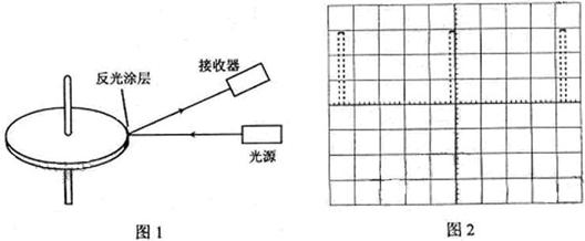 圖1是利用激光測轉(zhuǎn)速的原理示意圖,圖中圓盤可繞固定軸轉(zhuǎn)動(dòng),盤邊緣側(cè)面上有一小段涂有很薄的反光材料。當(dāng)盤轉(zhuǎn)到某一位置時(shí),接收器可以接受到反光涂層所反射的激光束,并將所收到的光信號(hào)轉(zhuǎn)變成電信號(hào),在顯示屏上顯示出來(如圖2所示)。