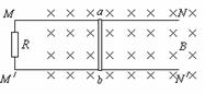 (8分)如圖所示,平行光滑導(dǎo)軌MN和M′N′置于水平面內(nèi),導(dǎo)軌間距為l,電阻可以忽略不計(jì)。導(dǎo)軌的左端通過(guò)電阻忽略不計(jì)的導(dǎo)線接一阻值為R的定值電阻。金屬棒ab垂直于導(dǎo)軌放置,其阻值也為R。導(dǎo)軌處于磁感應(yīng)強(qiáng)度為B、方向豎直向下的勻強(qiáng)磁場(chǎng)中。當(dāng)金屬棒ab在導(dǎo)軌上以某一速度向右做勻速滑動(dòng)時(shí),定值電阻R兩端的電壓為U。