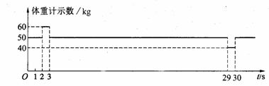 為了測量某住宅大樓每層的平均高度(層高)及電梯運行情況,甲、乙兩位同學在一樓 電梯內(nèi)用電子體重計及秒表進行了以下實驗,甲同學站在體重計上,乙同學記錄電梯從地面一樓到頂層全過程中,體重計示數(shù)隨時間變化的情況,并作出了如下圖所示的圖像。已知t=0時,電梯靜止不動,從電梯內(nèi)樓層按鈕上獲知該大樓共19層。