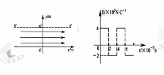 如圖所示,在y=0和y=2m之間有沿著x軸方向的勻強(qiáng)電場(chǎng),MN為電場(chǎng)區(qū)域的上邊界,在x軸方向范圍足夠大。電場(chǎng)強(qiáng)度的變化如圖所示,取x軸正方向?yàn)殡妶?chǎng)正方向,F(xiàn)有一個(gè)帶負(fù)電的粒子,粒子的比荷為