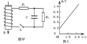 在如圖甲所示的電路中,螺線(xiàn)管匝數(shù)n=1500匝,橫截面積S=20 cm2。螺線(xiàn)管導(dǎo)線(xiàn)電阻r=1.0Ω,R1=4.0Ω, R2=5.0Ω, C=30μF 。在一段時(shí)間內(nèi),穿過(guò)螺線(xiàn)管的磁場(chǎng)的磁感應(yīng)強(qiáng)度B按如圖乙所示的規(guī)律變化。求:
