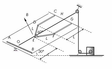 。一根質(zhì)量為m的導(dǎo)體棒AB在電機(jī)牽引下,以恒定速度v0沿OH方向從斜面底端開(kāi)始運(yùn)動(dòng),滑上導(dǎo)軌并到達(dá)斜面頂端, AB⊥OH。金屬導(dǎo)軌的CD、FG段電阻不計(jì),DEF段與AB棒材料橫截面積均相同,單位長(zhǎng)度的電阻均為r,O是AB棒的中點(diǎn),整個(gè)斜面處在垂直斜面向上、磁感應(yīng)強(qiáng)度為B的勻強(qiáng)磁場(chǎng)中。求: