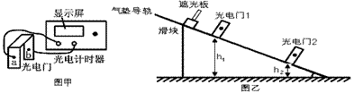 (6分)與打點(diǎn)計(jì)時(shí)器一樣,光電計(jì)時(shí)器也是一種研究物體運(yùn)動(dòng)情況的常用的計(jì)時(shí)儀器。如圖甲所示,a、b分別是光電門的激光發(fā)射和接收裝置,F(xiàn)利用如圖乙所示的裝置驗(yàn)證“機(jī)械能守恒定律”。方法是:在滑塊上安裝一遮光板,把滑塊放在傾斜放置的氣墊導(dǎo)軌上,連接好1、2兩個(gè)光電門。在圖示位置釋放滑塊后,光電計(jì)時(shí)器記錄下滑塊上的遮光板先后通過兩個(gè)光電門的時(shí)間分別為