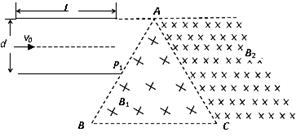 V的電壓,上板電勢(shì)高;現(xiàn)從左端沿中心軸線方向入射一個(gè)重力不計(jì)的帶電微粒,微粒質(zhì)量m=10-10kg,帶電量q=+10-4C,初速度v0=105m/s;中間用虛線框表示的正三角形內(nèi)存在垂直紙面向里的勻強(qiáng)磁場(chǎng)B1,三角形的上頂點(diǎn)A與上金屬板平齊,AB邊的中點(diǎn)P1恰好在下金屬板的右端點(diǎn);三角形區(qū)域的右側(cè)也存在垂直紙面向里,范圍足夠大的勻強(qiáng)磁場(chǎng)B2,且B2=4B1。求: