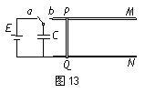 光滑平行金屬導(dǎo)軌M、N水平放置,導(dǎo)軌上放置著一根與導(dǎo)軌垂直的導(dǎo)體棒PQ。導(dǎo)軌左端與由電容為C的電容器、單刀雙擲開關(guān)和電動勢為E的電源組成的電路相連接,如圖13所示。在導(dǎo)軌所在的空間存在方向垂直于導(dǎo)軌平面的勻強(qiáng)磁場(圖中未畫出)。先將開關(guān)接在位置a,使電容器充電并達(dá)到穩(wěn)定后,再將開關(guān)撥到位置b。導(dǎo)體棒將會在磁場的作用下開始向右運(yùn)動,設(shè)導(dǎo)軌足夠長。則以下說法中正確的是 ( )