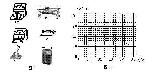 (2)圖17為該同學(xué)根據(jù)上述設(shè)計(jì)的實(shí)驗(yàn)電路測出多組數(shù)據(jù)并繪出的I1-I2圖線(I1為電流表A1的示數(shù),I2為電流表A2的示數(shù)),則由圖線可以得到被測電池的電動勢E= V,內(nèi)阻r= Ω。(保留兩位有效數(shù)字)