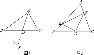 (2)解決問(wèn)題:受到(1)的啟發(fā),請(qǐng)你證明下列命題:如圖2,在△ABC中,D是BC邊上的中點(diǎn),DE⊥DF,DE交AB于點(diǎn)E,DF交AC于點(diǎn)F,連接EF.