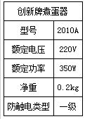 小華家新買了一個煮蛋器,其外觀如圖所示.該煮蛋器一次可煮6只雞蛋,銘牌如下表所示.一次,媽媽將6只質(zhì)量均為50g的雞蛋裝入煮蛋器,通電3min后,媽媽斷開電源,再過2min,媽媽從煮蛋器中取出雞蛋,小華發(fā)現(xiàn),雞蛋已經(jīng)完全煮熟了.則: