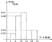 如圖是樣本容量為200的頻率分布直方圖.根據(jù)樣本的頻率分布直方圖估計,樣本數(shù)據(jù)落在(2,10)內(nèi)的頻率約為________.