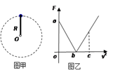 如圖甲所示,輕桿一端固定在O點(diǎn),另一端固定一小球,現(xiàn)讓小球在豎直平面內(nèi)做半徑為R的圓周運(yùn)動(dòng)。小球運(yùn)動(dòng)到最高點(diǎn)時(shí),桿與小球間彈力大小為F,小球在最高點(diǎn)的速度大小為v,其F一v2圖象如乙圖所示。則 ![]()