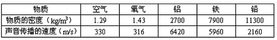 | 下表列出了相同條件下不同物質(zhì)的密度及聲音在其中傳播的速度,根據(jù)表中提供的信息,可以得出的結(jié)論是 |