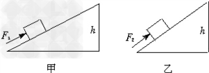 | 如圖所示,甲、乙兩斜面(不計(jì)摩擦)高度均為h,但甲比乙長,現(xiàn)把質(zhì)量相等的兩個(gè)物體從斜面底端勻速推到斜面頂端,則推力F1與F2的關(guān)系為 |